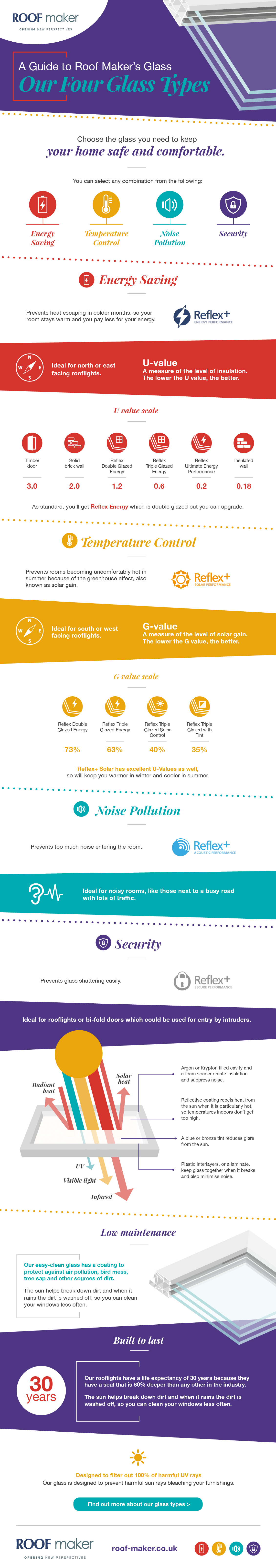 Roof Maker glazing types are made from 6mm toughened safety glass with argon filled cavities separated by an Edgetech foam spacer. Our rooflights are supplied with triple or double glazing which offers excellent thermal and noise insulation.